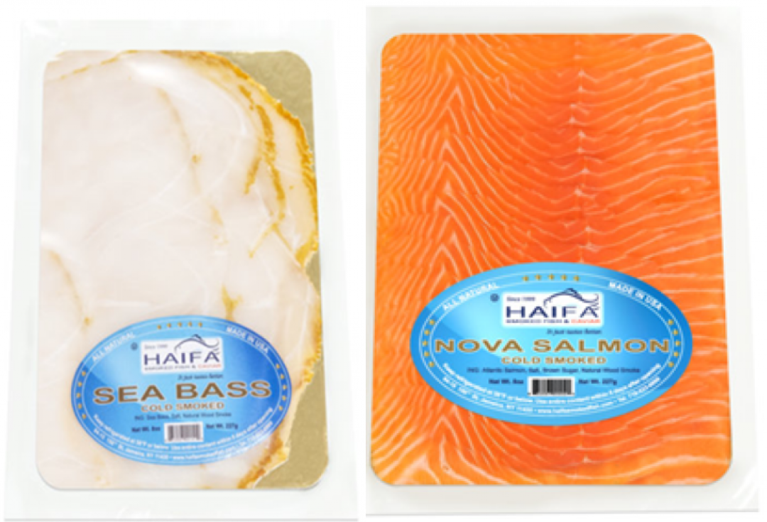 Haifa ”COLD SMOKED SALMON” 8 OZ., LOT # 219 and “COLD SMOKED SEABASS” 8 OZ., LOT # 212 are vacuum packaged on a paper board with flexible plastic.